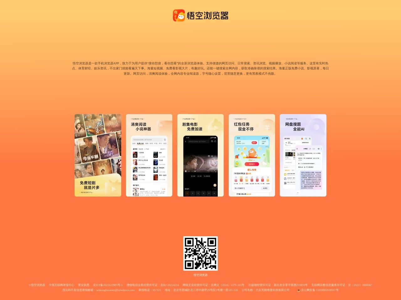 悟空浏览器是一款手机浏览器APP,致力于为用户提供“搜你想搜,看你想看”的全新浏览器体验。支持便捷的网页访问、日常搜索、资讯浏览、视频播放、小说阅读等服务。这里有实时热点、体育财经、娱乐资讯,不出家门就能看遍天下事。海量短视频、免费看影视大片,有趣好玩。还能一键搜索全网内容,获取准确靠谱的搜索结果。海量正版免费小说、影视原著,每日更新。网页访问,清爽阅读体验,全网内容专业阅读器,宇号随心设置,背景随意更换,更有黑夜模式不伤眼。